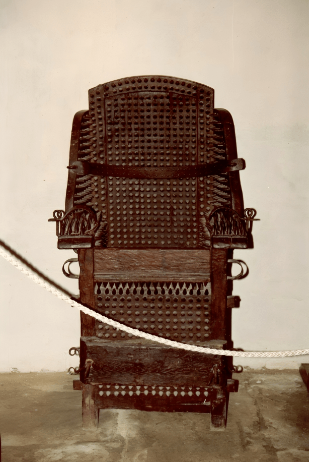 En otra planta se agrupan instrumentos destinados al castigo físico y a la tortura de reos. Entre las piezas expuestas (algunas originales y otras reconstrucciones fieles) se encuentran potros de estiramiento, grilletes, garrotes y mecanismos ideados para prolongar el sufrimiento. Cada objeto se acompaña de una explicación histórica que indica su uso, la tipología de delito al que se asociaba y el contexto geográfico y temporal de aplicación.