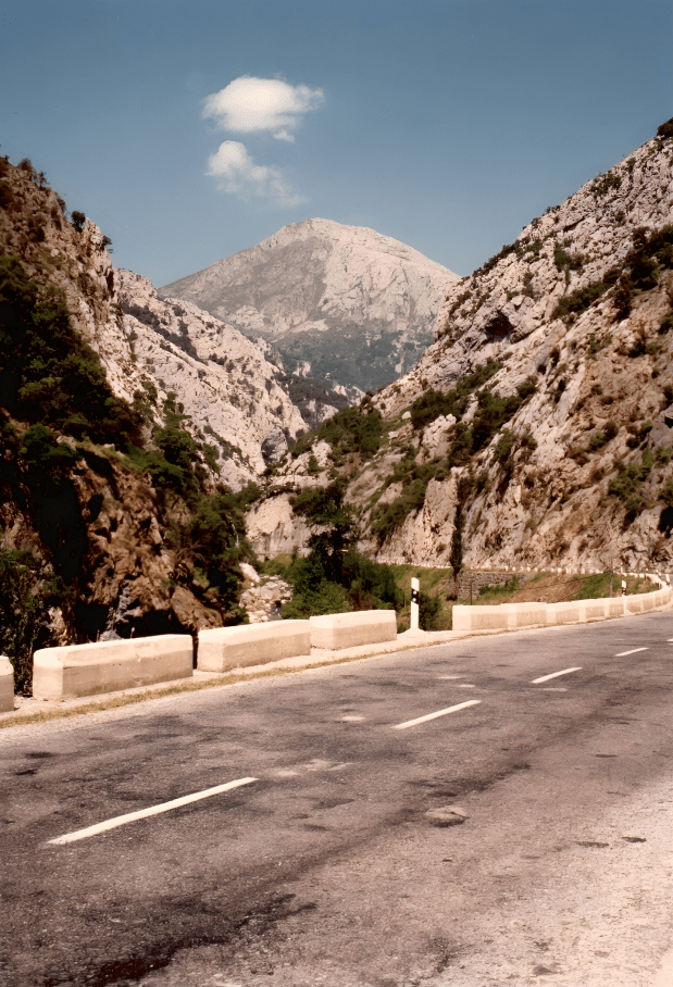 El río, de aguas vivas y transparentes, acompaña el recorrido con un murmullo constante. En algunos tramos, la carretera parece suspendida entre la roca y el vacío, adaptándose con precisión a la topografía. La sensación de estrechez, combinada con la altura de las paredes, intensifica la percepción de profundidad.