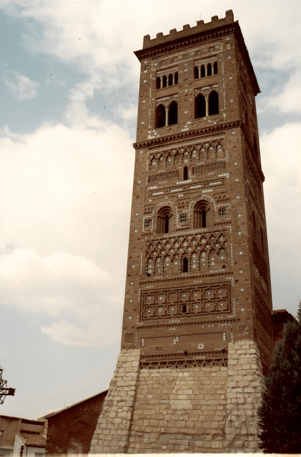 La torre mudéjar data del siglo XIII y presenta un paso inferior cubierto por una bóveda de cañón apuntado que da acceso a la calle. Es de planta cuadrada y posee tres cuerpos profusamente decorados con cerámica.