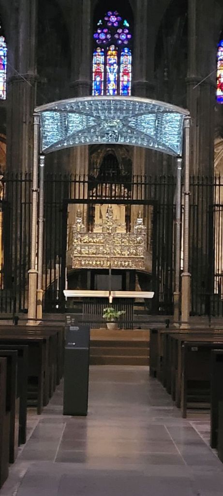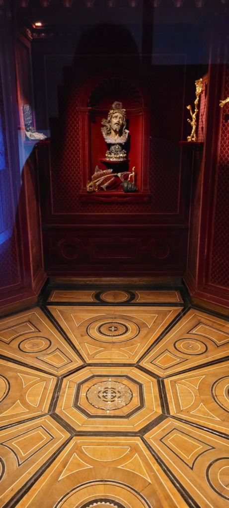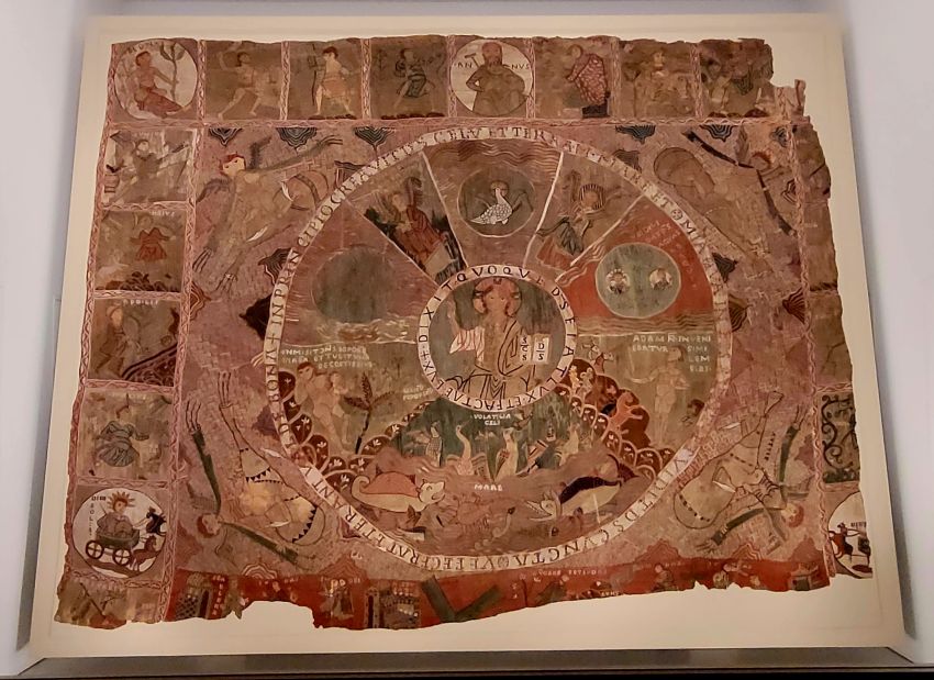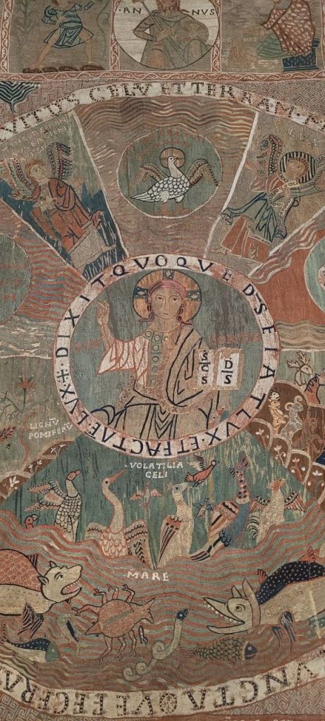 Antes de abandonar el templo, visitamos el Tesoro de la Catedral, el cual se encuentra en el Museo Capitular. Es de destacar el conocido como Tapiz de la Creación, aunque curiosamente la técnica con la que se hizo fue el bordado. Presenta un mensaje complejo narrado mediante escenas bíblicas, símbolos, alegorías e historia sacra. En la rueda central explica el inicio del primer libro bíblico: el Génesis, y a su alrededor se desarrollan una serie de cuadros donde el protagonismo lo toma el tiempo y sus segmentaciones (el año, las estaciones, los meses y los días).