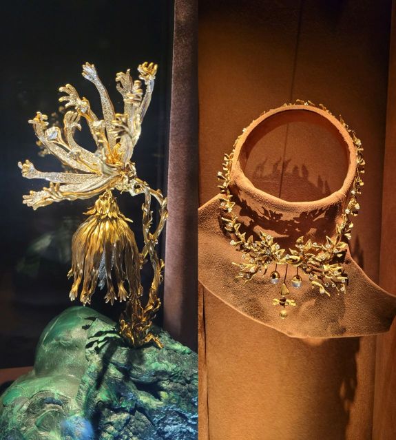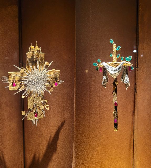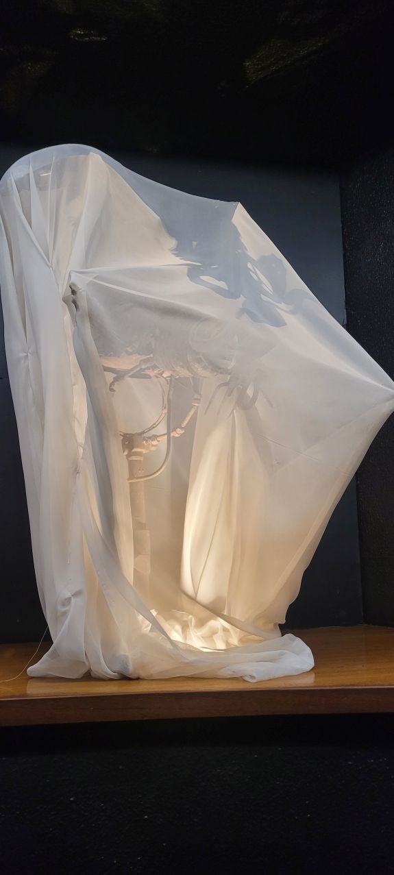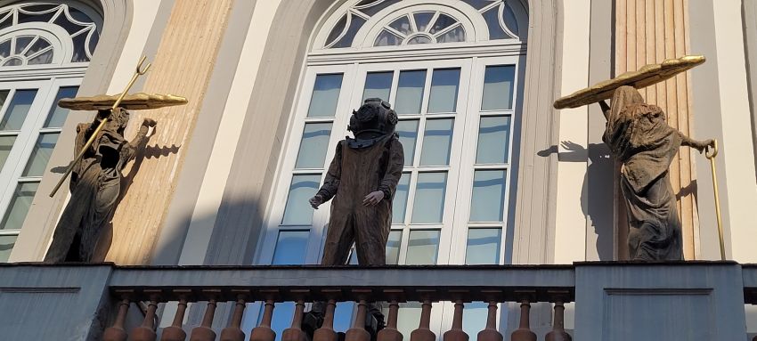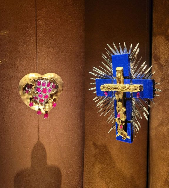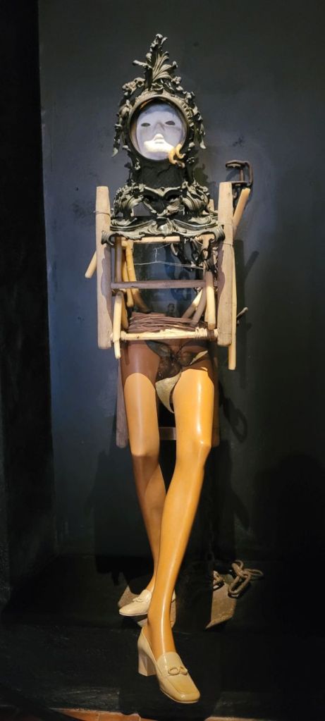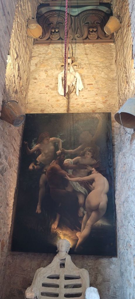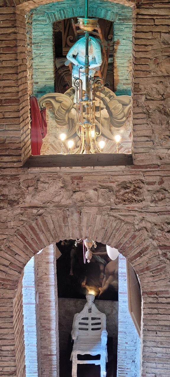 En las paredes que delimitan el antiguo teatro, los maniquíes nos dan la bienvenida entre los restos de vigas quemadas, los monstruos “grotescos”, los ocho bajorrelieves de la serie “Artes y oficios” realizados para la Exposición Universal de Paris de 1900, y los lavabos metafísicos que asemejan ángeles.