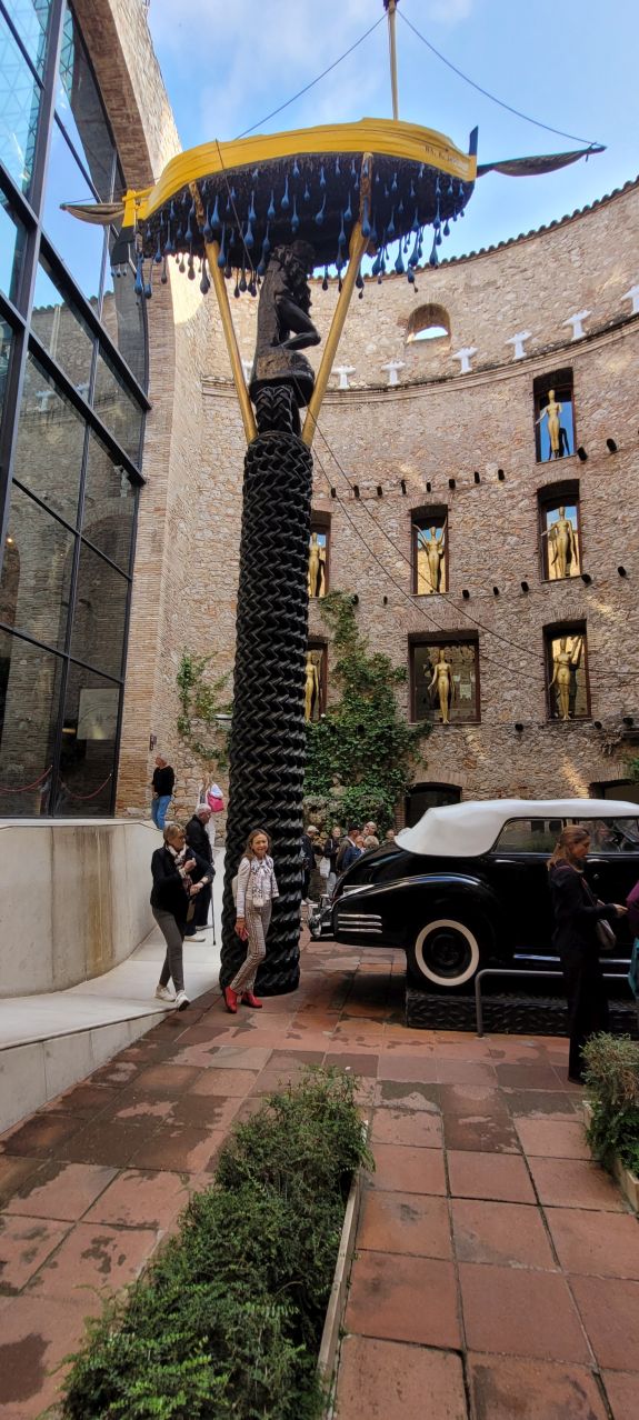 Accedimos, en primer lugar, al patio central, un jardín a cielo abierto, el antiguo patio de butacas del Teatro Municipal de Figueres. Destacan la instalación vertical con el imponente Cadillac situado en el centro; la escultura La gran Esther de Ernst Fuchs, que estira, con sus daenas, la columna trajana de neumáticos; el busto de mármol de François Girardon y el Esclavo dalinizado de Miguel Ángel, junto con la barca de Gala y un paraguas negro, elementos que conforman, según Dalí, el monumento surrealista más grande del mundo.