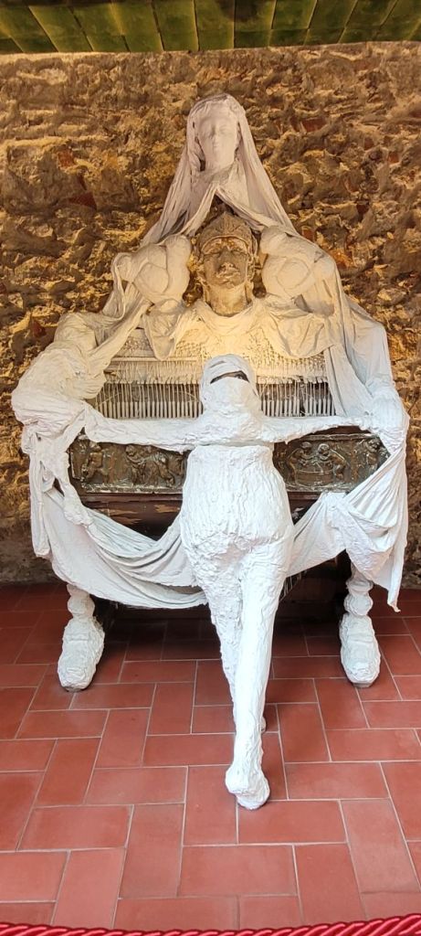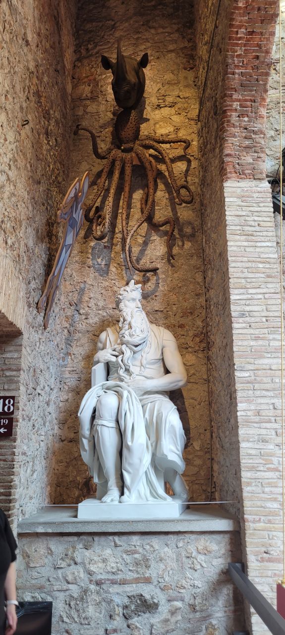 Camino a la Sala del Tesoro, llama la atención una escultura, homenaje a El Poli y la Puça (el piojo y la pulga), Amadeu Torres y Teresa Marqués, dos personajes legendarios de sus recuerdos de infancia, dos personajes populares de la Figueres de principio de siglo XX, que tocaban el manubrio por las calles a cambio de unas cuantas monedas.