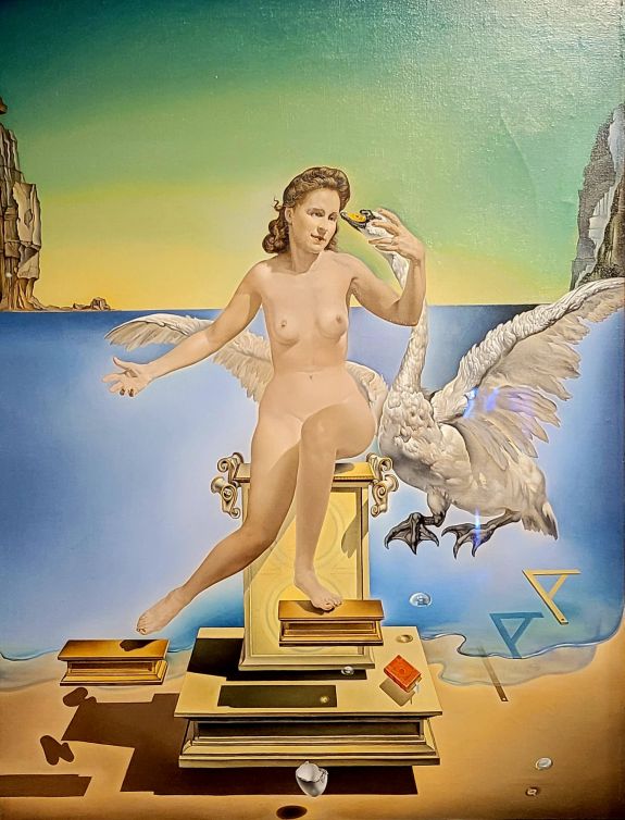 Esta creación está acompañada de la presencia de Gala. A la derecha, Gala de espaldas mirando un espejo invisible y, a la izquierda, Leda Atómica, obra en la que se evidencia el interés de Dalí por la ciencia.