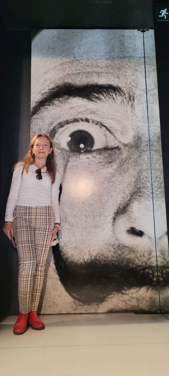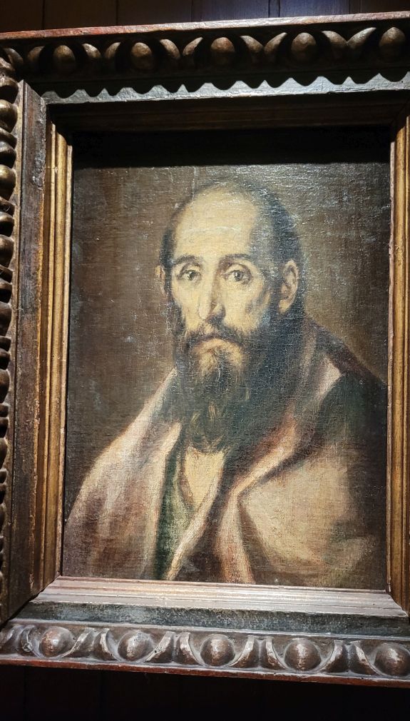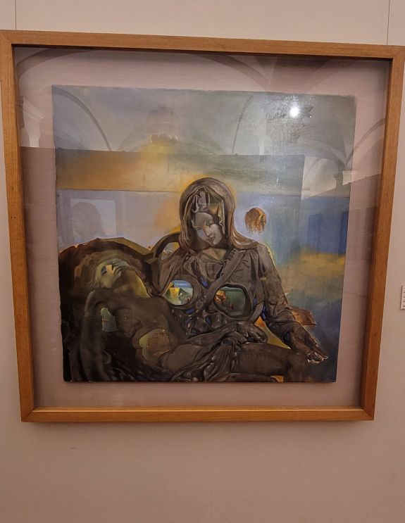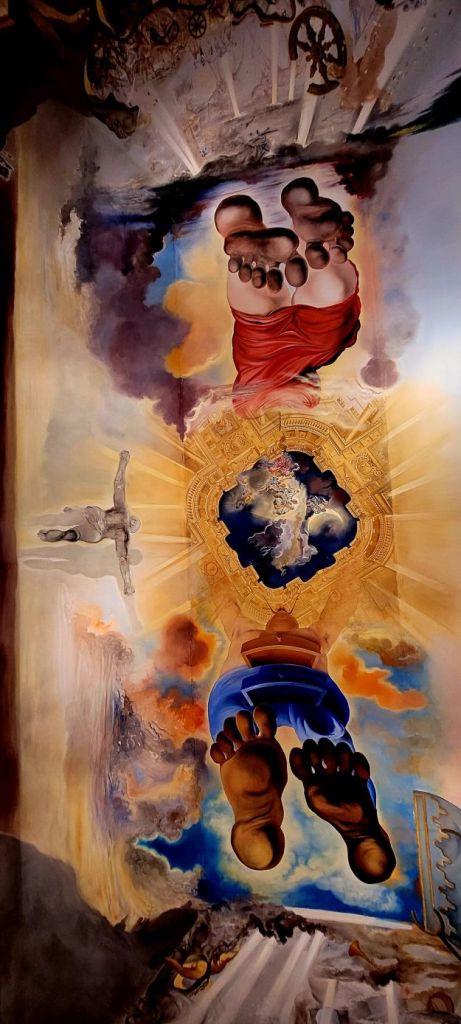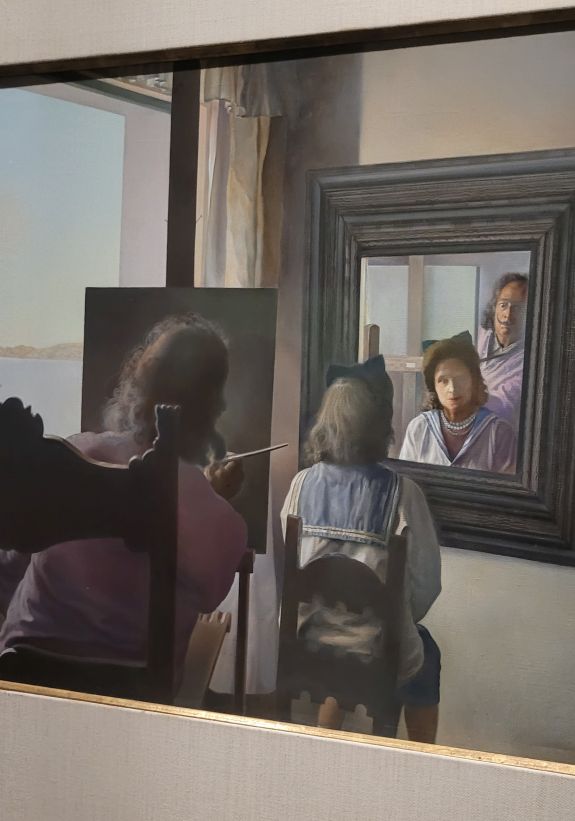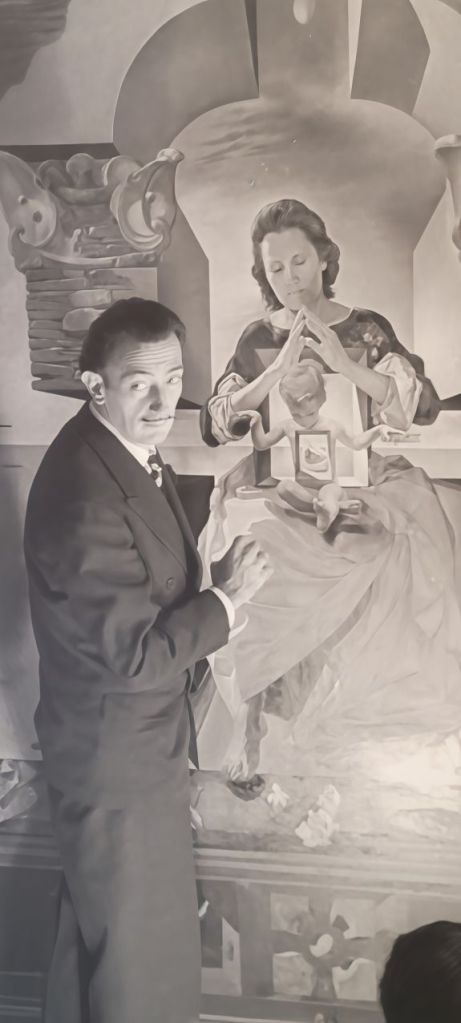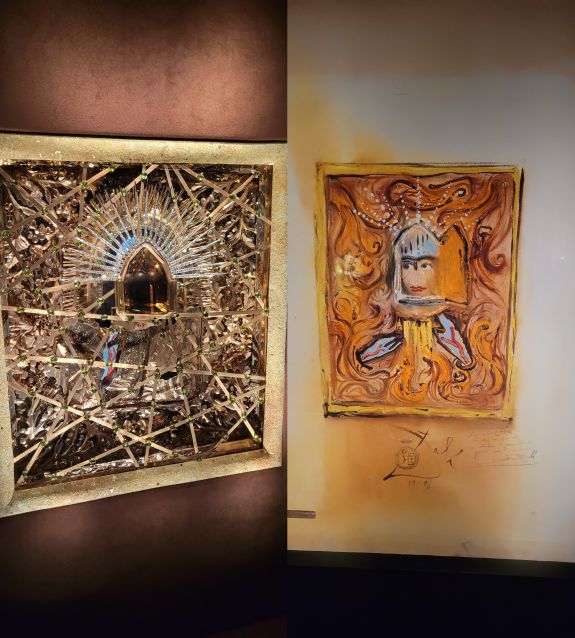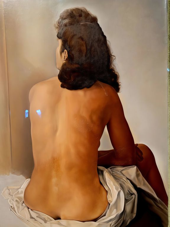 Junto a un óleo de El Greco, San Pablo, podemos ver Dalí de espaldas pintando a Gala de espaldas eternizada por seis córneas virtuales provisionalmente reflejadas en seis verdaderos espejos.