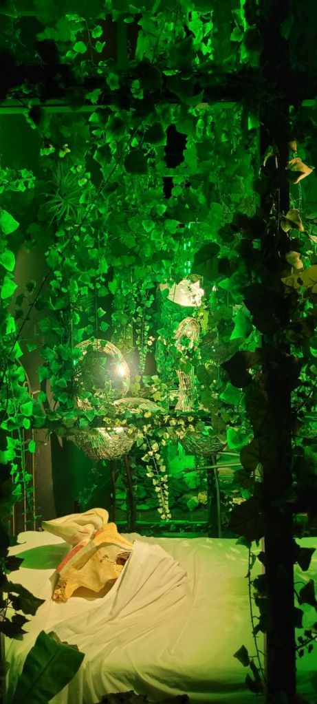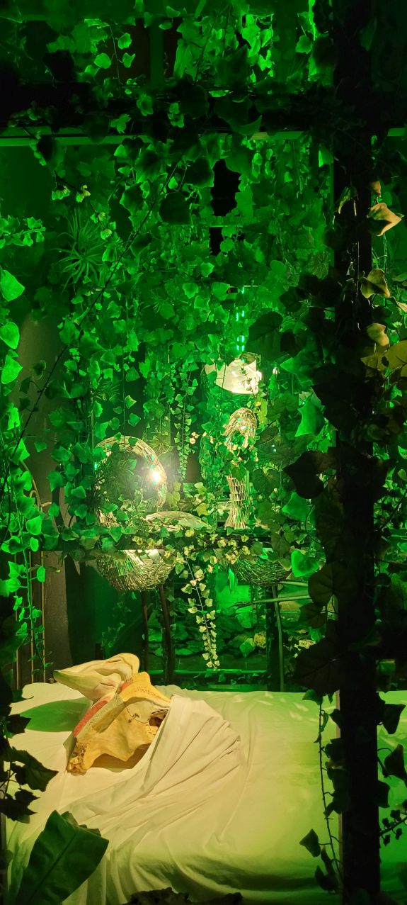En la zona del dormitorio hay que destacar la cama, en forma de concha, que proviene del legendario burdel parisino Le Chabanais y que perteneció a la Castiglioni, una de las favoritas de Napoleón III. Al lado de la cama, una escultura formada por el esqueleto dorado de un gorila con una reproducción en su interior de la cabeza de El éxtasis de Santa Teresa, escultura de Bernini que se encuentra en la iglesia de Santa Maria della Vittoria en Roma, y que ya tuvimos la suerte de contemplar en nuestro viaje a la capital italiana.
