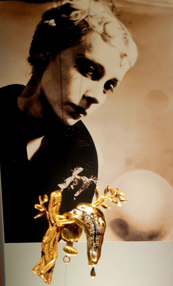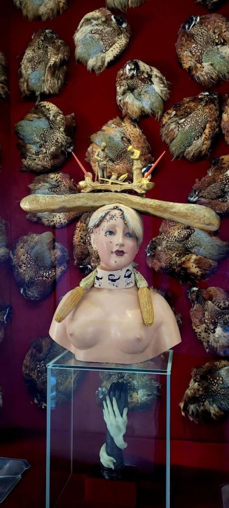 Ya en el pasillo nos encontramos con la primera de una serie seguida de tres vitrinas con fondo forrado de plumas de faisán. En ésta hay que destacar la reproducción del Busto de mujer retrospectivo, realizado en 1933 y expuesto por primera vez en la exposición surrealista de la galería Pierre Colle de París el mismo año.