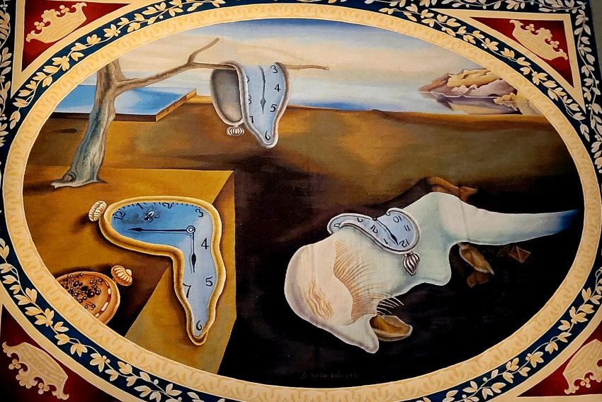 Sobre la cama se expone el tapiz con la reproducción de la obra La persistencia de la memoria, que se exhibe en el Museo de Arte Moderto de Nueva York, en el que vemos sus conocidos relojes blandos.