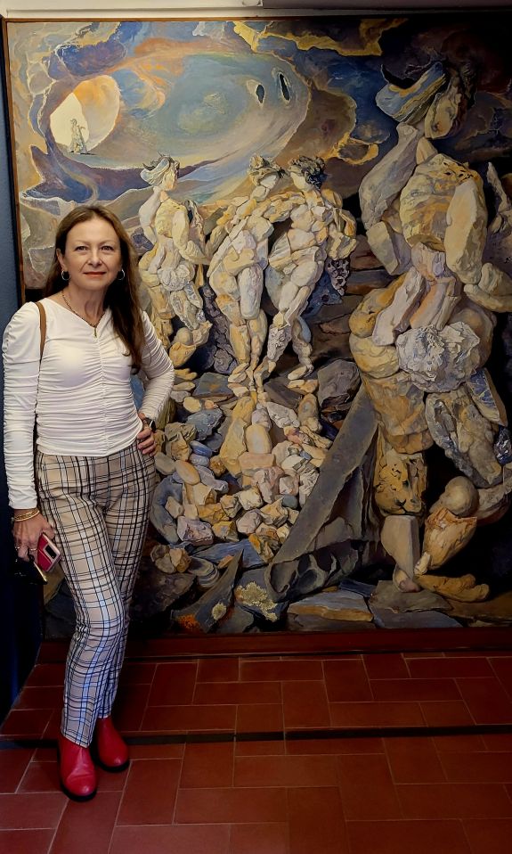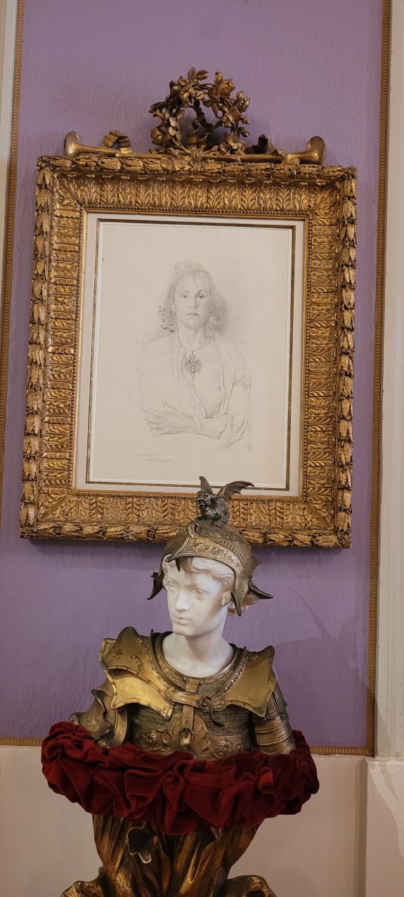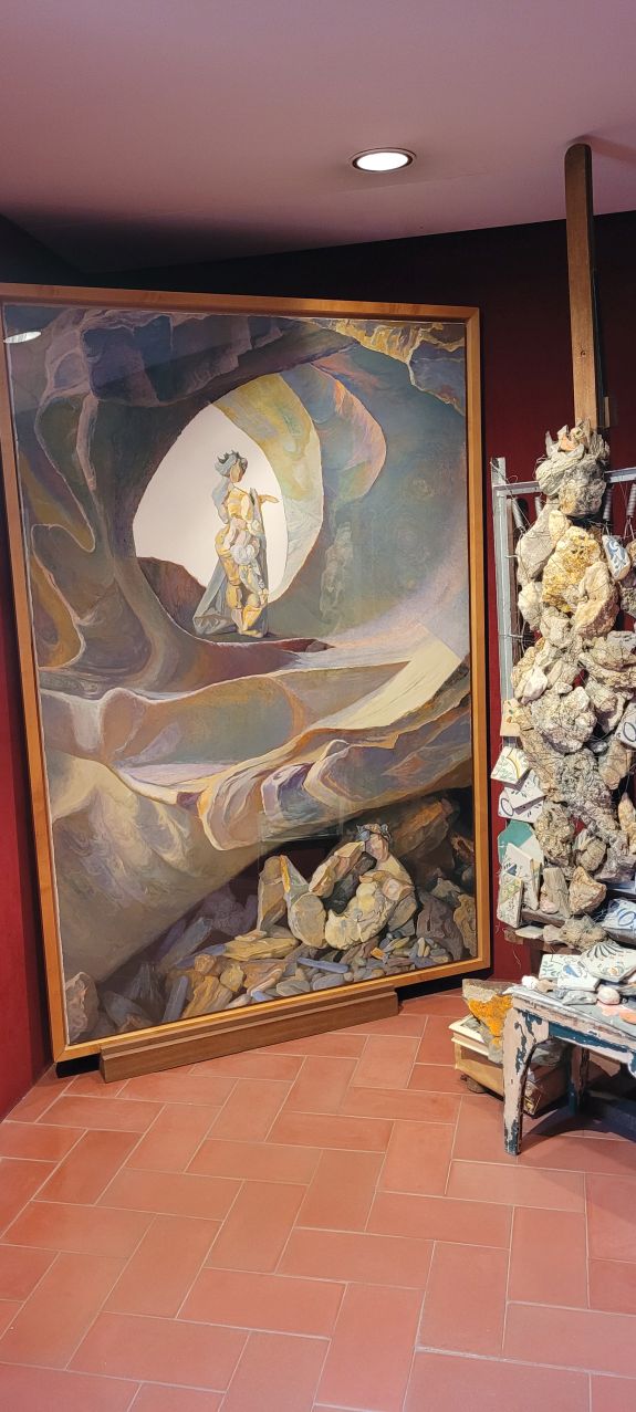 Cuando entramos en el recibidor, a la izquierda, podemos observar el óleo titulado Mnémosine, madre de las musas, quien, con su gesto, nos invita a entrar.