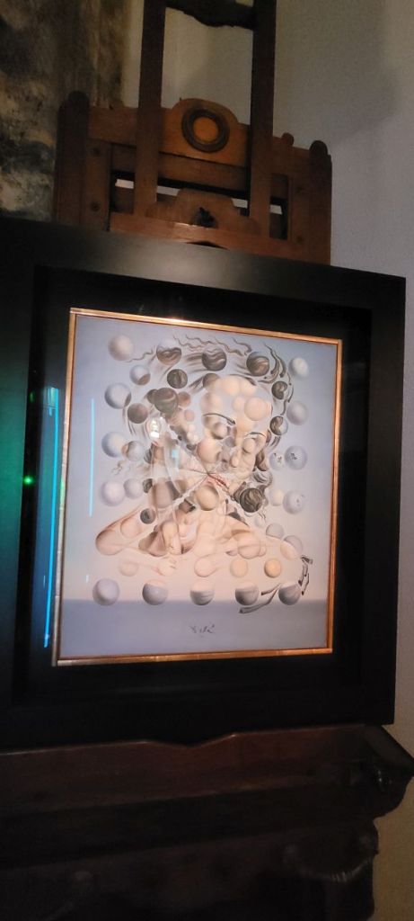 En un caballete, otro retrato de Gala: Galatea de las esferas, de la época místico-nuclear, en el que el artista muestra el eterno femenino representado por el rostro de Gala.