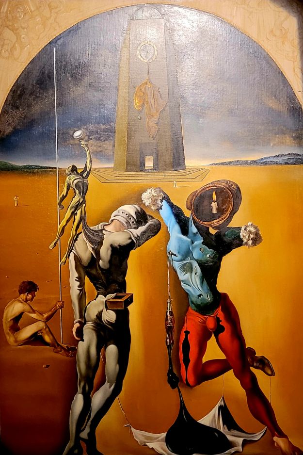 Destaca un traje de buzo con escafandra, alusión a la conferencia de Dalí, realizada en junio de 1936 con motivo de la Exposición Internacional del Surrealismo en Londres, que a punto estuvo de costarle la vida por asfixia.