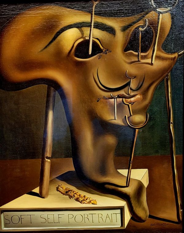 En Autorretrato blando con bacon frito aparece un rostro amorfo, blando, sujeto por muletas, que Dalí considera su autorretrato, con un pedestal que lleva inscrito el título de la obra y, encima, un trozo de panceta frita, símbolo de la materia orgánica y de lo cotidiano de los desayunos del artista en el hotel Saint Regis de Nueva York.