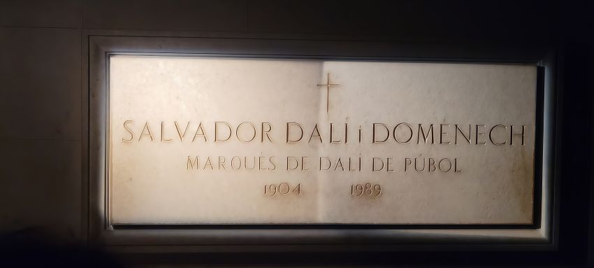 La cripta está presidida por la losa funeraria de piedra de Figueres, con la inscripción “Salvador Dalí y Domènech, Marqués de Dalí de Púbol. 1904-1989”, acompañada por seis caduceos de la misma serie “Dalí d’Or”.